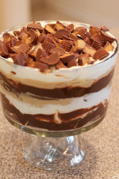 ***Cut your brownies into cubes and put half of them along the bottom of your trifle dish. After this you just put the different layers on in any order you like and then repeat. Then top with sliced Reeses Peanut Butter Cups! It’s so pretty at the end you will want to dig right in and start eating!